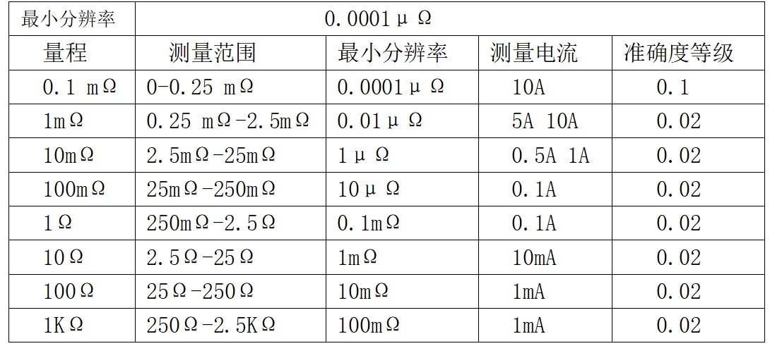 电阻档位:2.5 KΩ、250Ω、25Ω、2.5Ω、250mΩ、25mΩ、2.5mΩ、0.25 mΩ